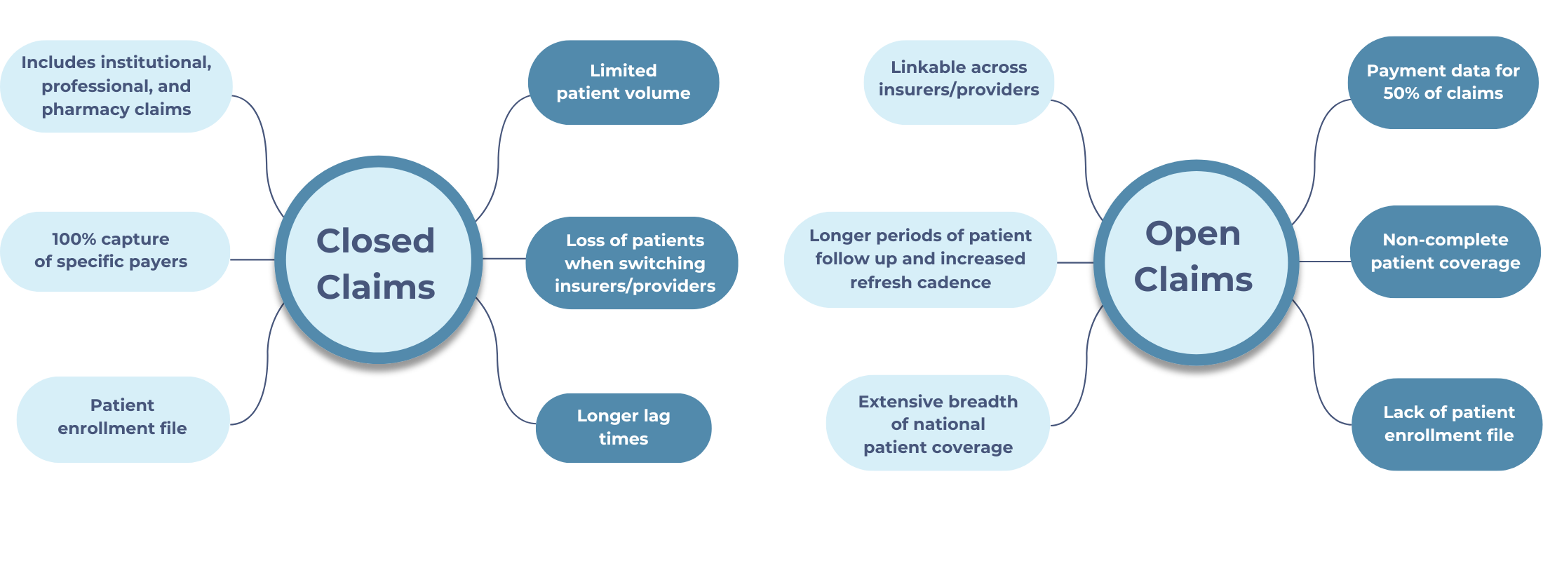 Closed claims data aids in outcomes of comparative effectiveness studies, exploring costs of care, unmet needs, treatment patterns, and disease progression. Combining closed and open data can provide insight into out-of-pocket or out-of-network care, and expand visibility into the patient journey beyond periods of enrollment in commercial health insurance plans.